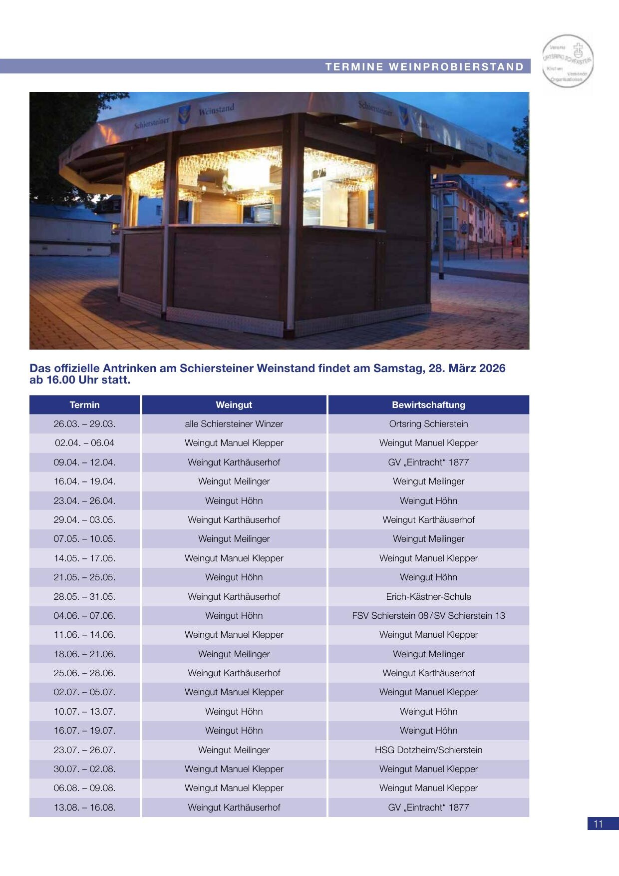 Termine Weinprobierstand Das offizielle Antrinken am Schiersteiner Weinstand findet am Samstag, 28. März 2026 ab 16.00 Uhr statt. Termin Weingut Bewirtschaftung 26.03. – 29.03. alle Schiersteiner Winzer Ortsring Schierstein 02.04. – 06.04. Weingut Manuel Klepper Weingut Manuel Klepper 09.04. – 12.04. Weingut Karthäuserhof GV „Eintracht“ 1877 16.04. – 19.04. Weingut Meilinger Weingut Meilinger 23.04. – […]