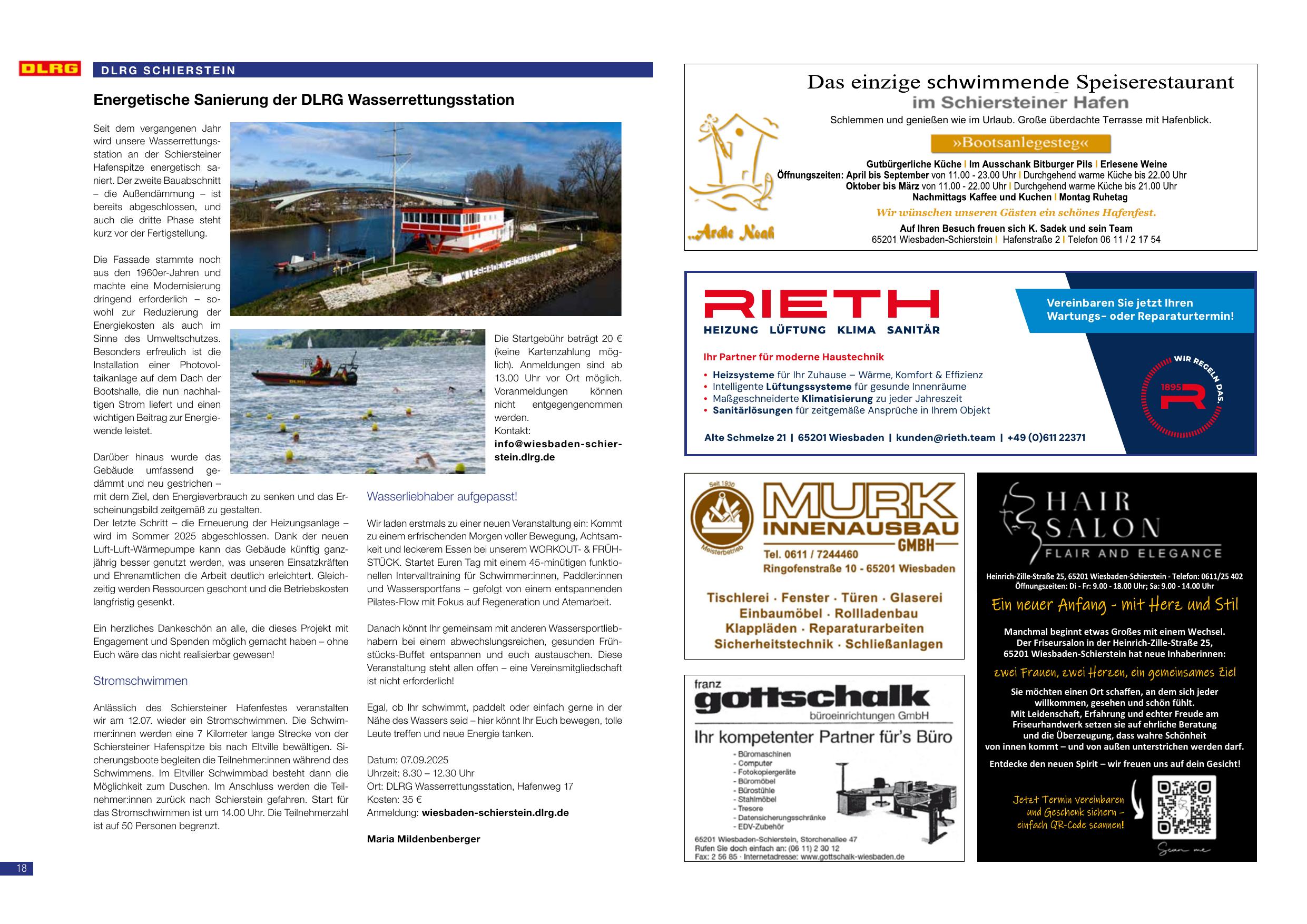 - Sommer 2025 – Abschluss der Erneuerung der Heizungsanlage (Luft-Luft-Wärmepumpe) als letzter Schritt der energetischen Sanierung der DLRG Wasserrettungsstation – (DLRG Wasserrettungsstation, Schiersteiner Hafenspitze)