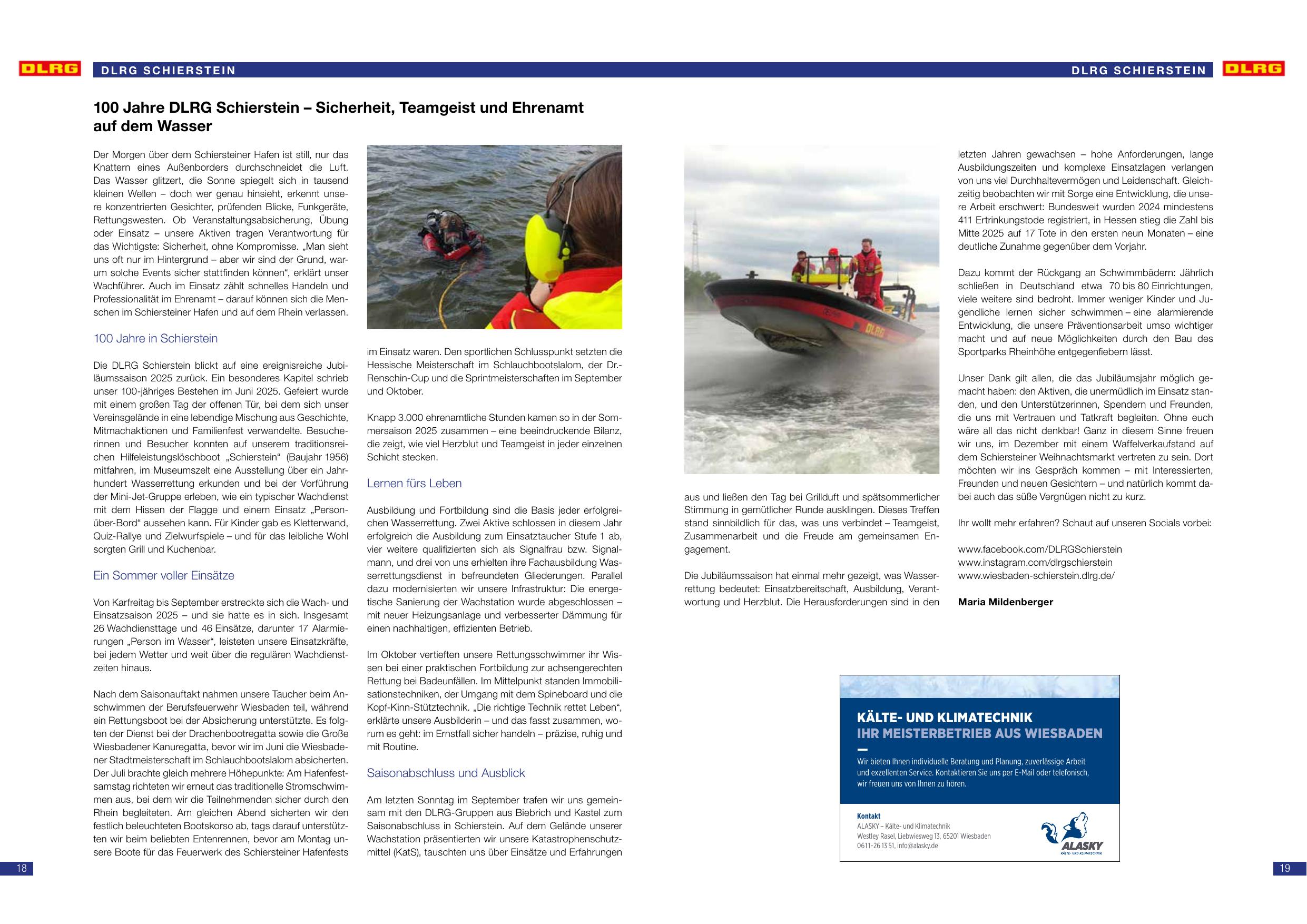 Die DLRG Schierstein blickt auf eine ereignisreiche Jubiläumssaison 2025 zurück. Ein besonderes Kapitel schrieb unser 100-jähriges Bestehen im Juni 2025. Gefeiert wurde mit einem großen Tag der offenen Tür, bei dem sich unser Vereinsgelände in eine lebendige Mischung aus Geschichte, Mitmachaktionen und Familienfest verwandelte. Besucherinnen und Besucher konnten auf unserem traditionsreichen Hilfeleistungslöschboot „Schierstein“ (Baujahr 1956) mitfahren, im Museumszelt eine Ausstellung über ein Jahrhundert Wasserrettung erkunden und bei der Vorführung der Mini-Jet-Gruppe erleben, wie ein typischer Wachdienst mit dem Hissen der Flagge und einem Einsatz „Personen-über-Bord“ aussehen kann. Für Kinder gab es Kletterstand, Quiz-Rallye und Zielwurfspiele – und für das leibliche Wohl sorgten Grill und Kuchenbar.