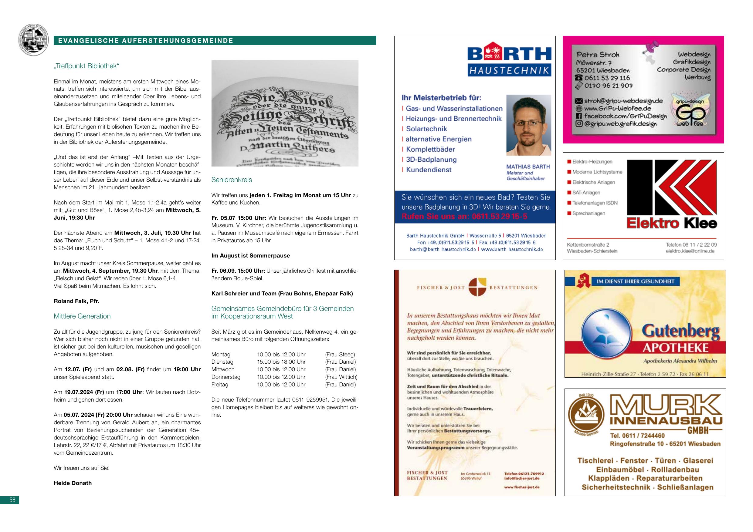 Der „Treffpunkt Bibliothek“ bietet dazu eine gute Möglichkeit, Erfahrungen mit biblischen Texten zu machen ihre Bedeutung für unser Leben heute zu erkennen. Wir treffen uns in der Bibliothek der Auferstehungsgemeinde.