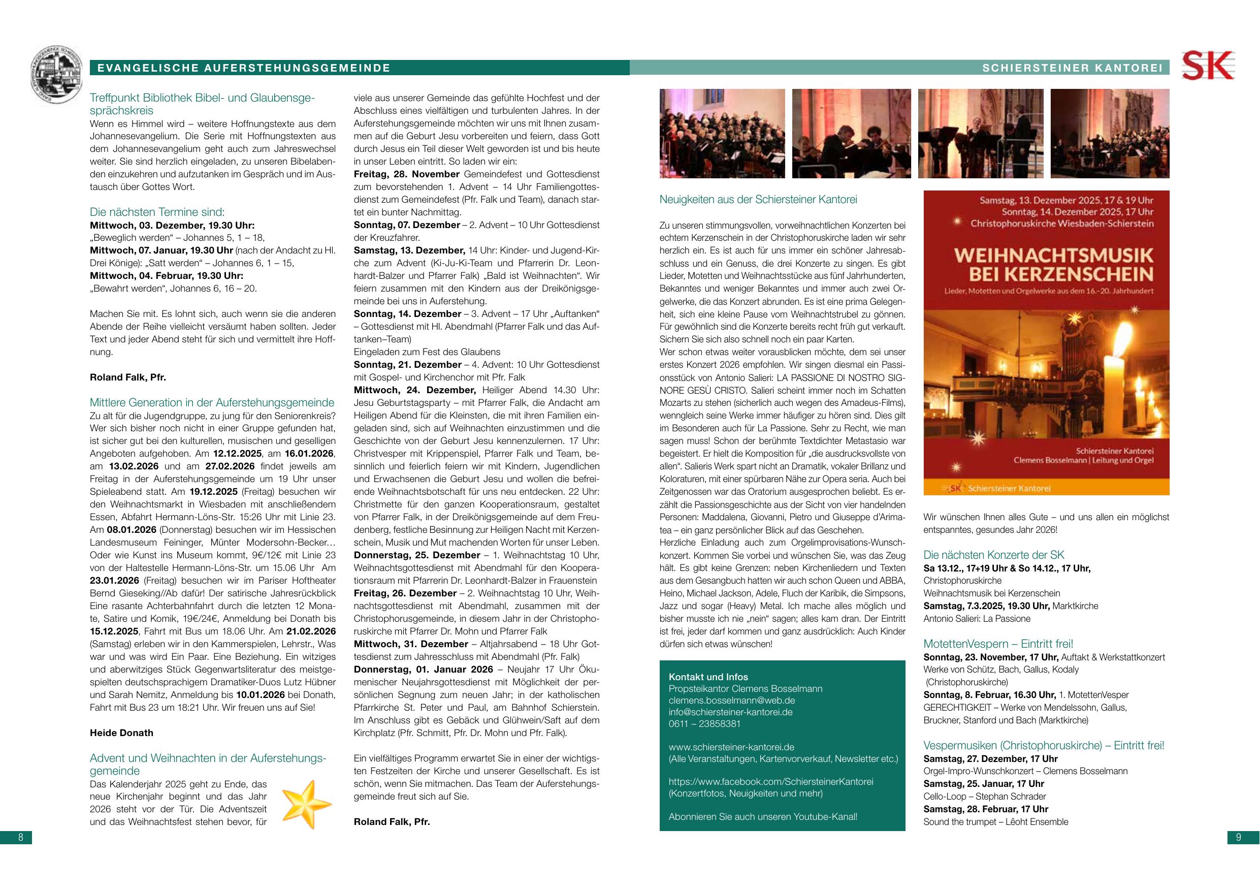 Donnerstag, 01. Januar 2026 – Neujahr 17 Uhr Ökumenischer Neujahrsgottesdienst mit Möglichkeit der persönlichen Segnung zum neuen Jahr; in der katholischen Pfarrkirche St. Peter und Paul, am Bahnhof Schierstein. Im Anschluss gibt es Gebäck und Glühwein/Saft auf dem Kirchplatz (Pfr. Schmitt, Pfr. Dr. Mohn und Pfr. Falk).