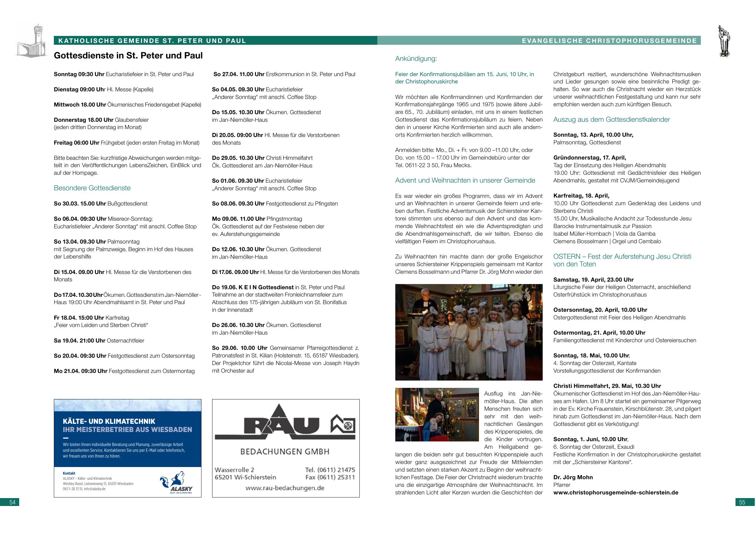 Zu Weihnachten hin machte dann der große Engelschor unseres Schiersteiner Krippenspiels gemeinsam mit Kantor Clemens Bosselmann und Pfarrer Dr. Jörg Mohn wieder den Christgeburt rezitiert, wunderschöne Weihnachtsmusiken und Lieder gesungen sowie eine besinnliche Predigt gehalten. So war auch die Christnacht wieder ein Herzstück unserer weihnachtlichen Festgestaltung und kann nur sehr empfohlen werden auch zum künftigen Besuch.