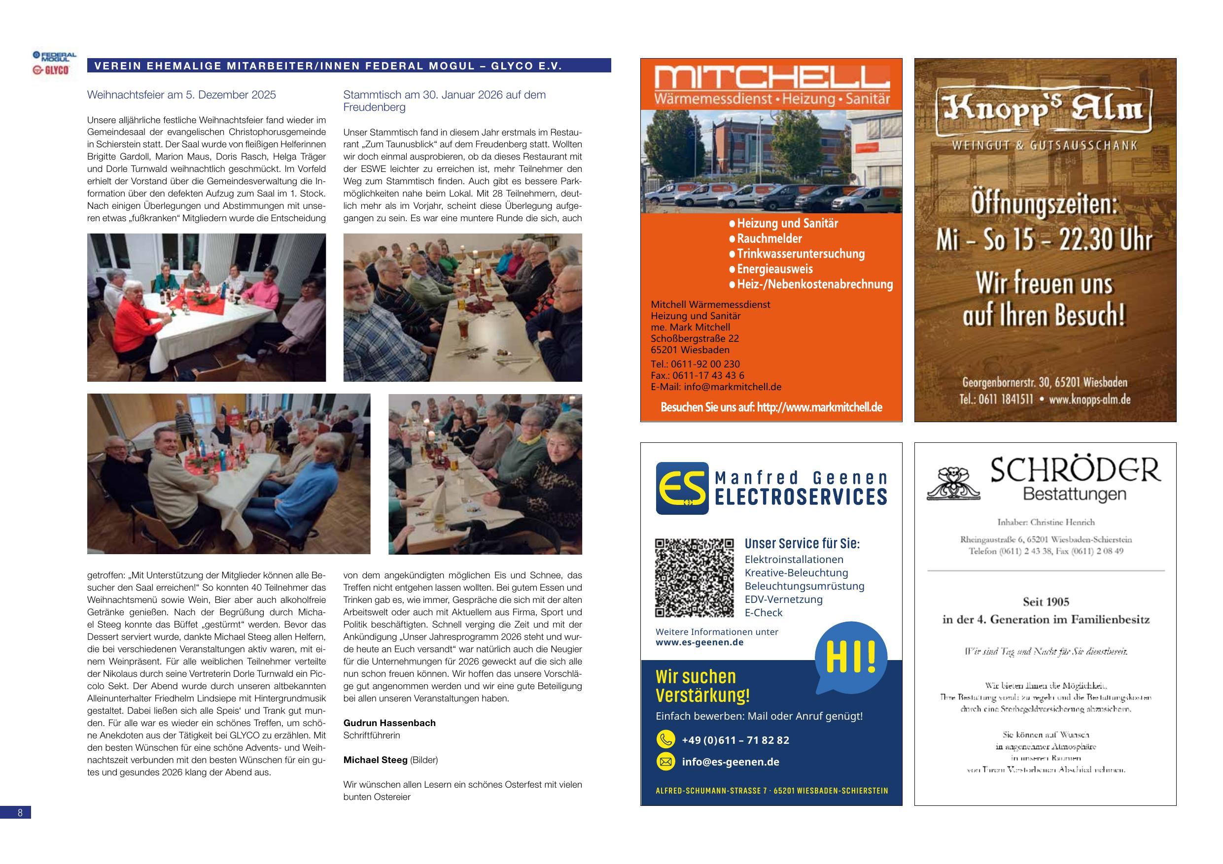 Unsere alljährliche festliche Weihnachtsfeier fand wieder im Gemeindesaal der evangelischen Christophorusgemeinde in Schierstein statt. Der Saal wurde von fleißigen Helferinnen Brigitte Gardoll, Marion Maus, Doris Rasch, Helga Träger und Dorle Turnwald weihnachtlich geschmückt. Im Vorfeld erhielt der Vorstand über die Gemeindesverwaltung die Information über den defekten Aufzug zum Saal im 1. Stock. Nach einigen Überlegungen und Abstimmungen mit unseren etwas „fußkranken“ Mitgliedern wurde die Entscheidung getroffen: „Mit Unterstützung der Mitglieder können alle Besucher den Saal erreichen!“ So konnten 40 Teilnehmer das Weihnachtsmenü sowie Wein, Bier aber auch alkoholfreie Getränke genießen. Nach der Begrüßung durch Michael Steeg konnte das Büffet „gestürmt“ werden. Bevor das Dessert serviert wurde, dankte Michael Steeg allen Helfern, die bei verschiedenen Veranstaltungen aktiv waren, mit einem Weinpräsent. Für alle weiblichen Teilnehmer verteilte der Nikolaus durch seine Vertreterin Dorle Turnwald ein Piccolo Sekt. Der Abend wurde durch unseren altbekannten Alleinunterhalter Friedhelm Lindsiepe mit Hintergrundmusik gestaltet. Dabei ließen sich alle Speis’ und Trank gut munden. Für alle war es wieder ein schönes Treffen, um schöne Anekdoten aus der Tätigkeit bei GLYCO zu erzählen. Mit den besten Wünschen für eine schöne Advents- und Weihnachtszeit verbunden mit den besten Wünschen für ein gutes und gesundes 2026 klang der Abend aus.