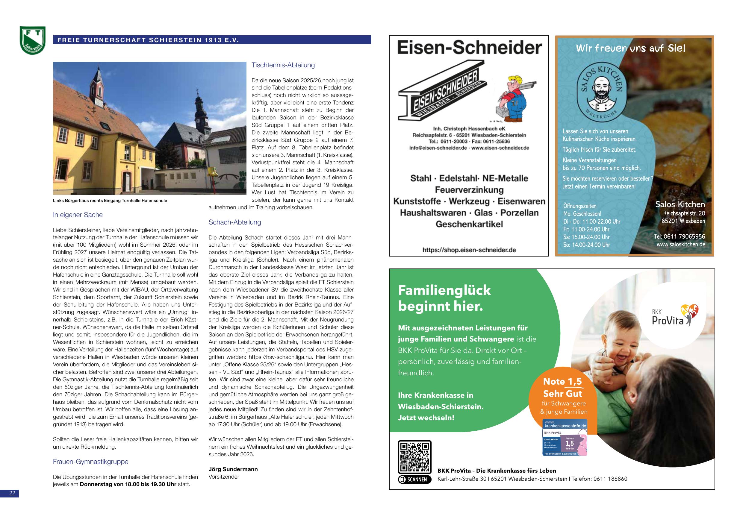 Liebe Schiersteiner, liebe Vereinsmitglieder, nach jahrzehntelanger Nutzung der Turnhalle der Hafenschule müssen wir (mit über 100 Mitgliedern) wohl im Sommer 2026, oder im Frühling 2027 unsere Heimat endgültig verlassen. Die Tatsache an sich ist besiegelt, über den genauen Zeitplan wurde noch nicht entschieden. Hintergrund ist der Umbau der Hafenschule in eine Ganztagsschule. Die Turnhalle soll wohl in einem Mehrzweckraum (mit Mensa) umgebaut werden. Wir sind in Gesprächen mit der WiBau, der Ortsverwaltung Schierstein, dem Sportamt, der Zukunft Schierstein sowie der Schulleitung der Hafenschule. Alle haben uns Unterstützung zugesagt. Wünschenswert wäre ein „Umzug“ innerhalb Schiersteins, z.B. in die Turnhalle der Erich-Kästner-Schule. Wünschenswert, da die Halle im selben Ortsteil liegt und somit, insbesondere für die Jugendlichen, die im Wesentlichen in Schierstein wohnen, leicht zu erreichen wäre. Eine Verteilung der Hallenzeiten (fünf Wochentage) auf verschiedene Hallen in Wiesbaden würde unseren kleinen Verein überfordern, die Mitglieder und das Vereinsleben sicher belasten. Betroffen sind zwei unserer drei Abteilungen. Die Gymnastik-Abteilung nutzt die Turnhalle regelmäßig seit den 50iger Jahre, die Tischtennis-Abteilung kontinuierlich seit den 70iger Jahren. Die Schachabteilung kann im Bürgerhaus bleiben, das aufgrund vom Denkmalschutz nicht vom Umbau betroffen ist. Wir hoffen alle, dass eine Lösung angestrebt wird, die zum Erhalt unseres Traditionsvereins (gegründet 1913) beitragen wird.