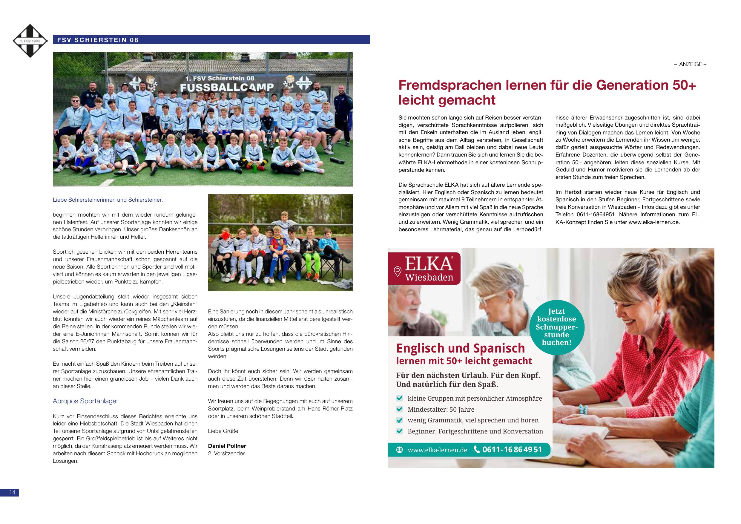 Kurz vor Einsendeschluss dieses Berichtes erreichte uns leider eine Hiobsbotschaft. Die Stadt Wiesbaden hat einen Teil unserer Sportanlage aufgrund von Unfallgefahrenstellen gesperrt. Ein Großfeldspielbetrieb ist bis auf Weiteres nicht möglich, da der Kunstrasenplatz erneuert werden muss. Wir arbeiten nach diesem Schock mit Hochdruck an möglichen Lösungen.