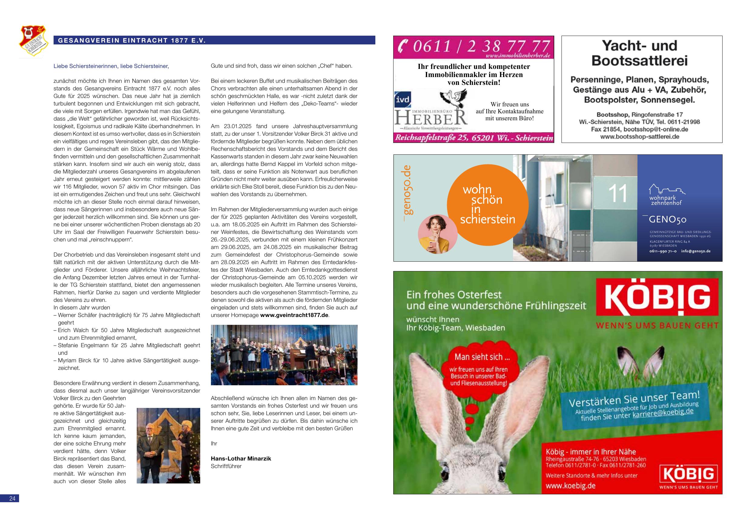 zunächst möchte ich Ihnen im Namen des gesamten Vorstands des Gesangvereins Eintracht 1877 e.V. noch alles Gute für 2025 wünschen. Das neue Jahr hat ja ziemlich turbulent begonnen und Entwicklungen mit sich gebracht, die viele mit Sorgen erfüllen. Irgendwie hat man das Gefühl, dass „die Welt“ gefährlicher geworden ist, weil Rücksichtslosigkeit, Egoismus und radikale Kälte überhandnehmen. In diesem Kontext ist es umso wertvoller, dass es in Schierstein ein vielfältiges und reges Vereinsleben gibt, das den Mitgliedern in der Gemeinschaft ein Stück Wärme und Wohlbefinden vermitteln und den gesellschaftlichen Zusammenhalt stärken kann. Insofern sind wir auch ein wenig stolz, dass die Mitgliederzahl unseres Gesangvereins im abgelaufenen Jahr erneut gesteigert werden konnte: mittlerweile zählen wir 116 Mitglieder, wovon 57 aktiv im Chor mitsingen. Das ist ein ermutigendes Zeichen und freut uns sehr. Gleichwohl möchte ich an dieser Stelle noch einmal darauf hinweisen, dass neue Sängerinnen und insbesondere auch neue Sänger jederzeit herzlich willkommen sind. Sie können uns gerne bei einer unserer wöchentlichen Proben dienstags ab 20 Uhr im Saal der Freiwilligen Feuerwehr Schierstein besuchen und mal „reinschnuppern“.