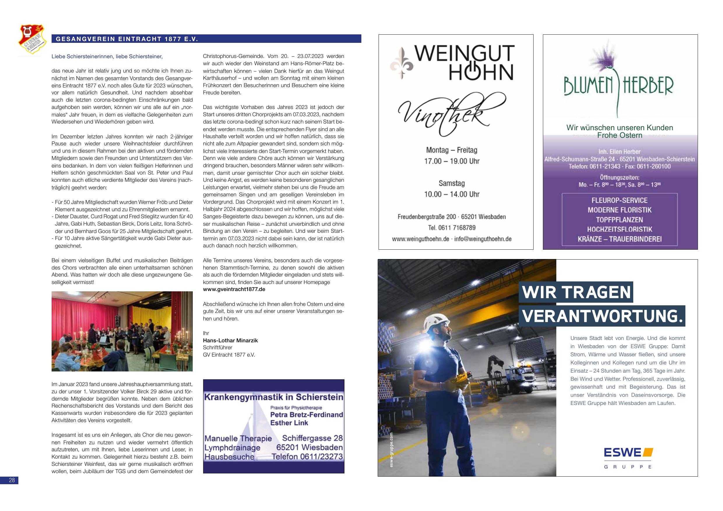 Insgesamt ist es uns ein Anliegen, als Chor die neu gewonnenen Freiheiten zu nutzen und wieder vermehrt öffentlich aufzutreten, um mit Ihnen, liebe Leserinnen und Leser, in Kontakt zu kommen. Gelegenheit hierzu besteht z.B. beim Schiersteiner Weinfest, das wir gerne musikalisch eröffnen wollen, beim Jubiläum der TGS und dem Gemeindefest der Christophorus-Gemeinde. Vom 20. – 23.07.2023 werden wir auch wieder den Weinstand am Hans-Römer-Platz bewirtschaften können – vielen Dank hierfür an das Weingut Karthäuserhof – und wollen am Sonntag mit einem kleinen Frühkonzert den Besucherinnen und Besuchern eine kleine Freude bereiten.