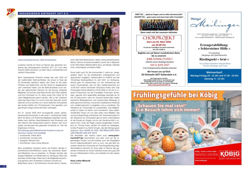 Somit steht auch für die kommenden 2 Jahre ein „eingespieltes Team“ für die anstehenden umfangreichen und spannenden Aufgaben, insbesondere im Hinblick auf das 150-jährige Vereinsjubiläum im Jahr 2027, zur Verfügung. Aktuell geht es insbesondere um die Vorbereitung des neuen Chorprojektes, das mit dem Jubiläumskonzert am 12.06.2027 seinen krönenden Abschluss finden wird. Das Chorprojekt startet offiziell am 03.03.2026 um 20 Uhr in unserem Probenraum bei der Freiwilligen Feuerwehr Schierstein, geprobt wird regelmäßig dienstags ebenfalls ab 20 Uhr. Es wäre schön, wenn wir – wie beim letzten Mal – wieder zahlreiche Mitsängerinnen und insbesondere Mitsänger (!) dafür gewinnen könnten, uns bei der musikalischen Reise bis zum Jubiläumskonzert zu begleiten und zu verstärken. Die Teilnahme am Chorprojekt ist unverbindlich, eine Mitgliedschaft im Verein ist hierfür nicht erforderlich. Aber selbstverständlich freuen wir uns über jedes neue Mitglied, das uns auch längerfristig unterstützen will. Voraussetzungen für die Teilnahme am Chorprojekt gibt es keine, entscheidend ist die Freude am Singen und an der Gemeinschaft in unserem Chor. Unter der Regie unseres langjährigen Chorleiters, Dr. Thomas Frank, werden wir wieder ein vielseitiges, buntes Programm zu Gehör bringen, das alle Altersgruppen anspricht. Also: KOMM ZU UNS, WIR BRAUCHEN DICH UND FREUEN UNS AUF DICH!