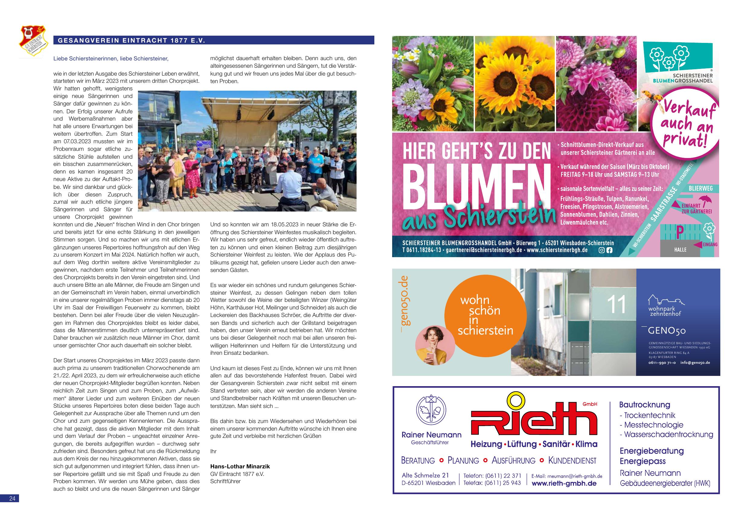 Und kaum ist dieses Fest zu Ende, können wir uns mit Ihnen allen auf das bevorstehende Hafenfest freuen. Dabei wird der Gesangverein Schierstein zwar nicht selbst mit einem Stand vertreten sein, aber wir werden die anderen Vereine und Standbetreiber nach Kräften mit unseren Besuchen unterstützen. Man sieht sich …