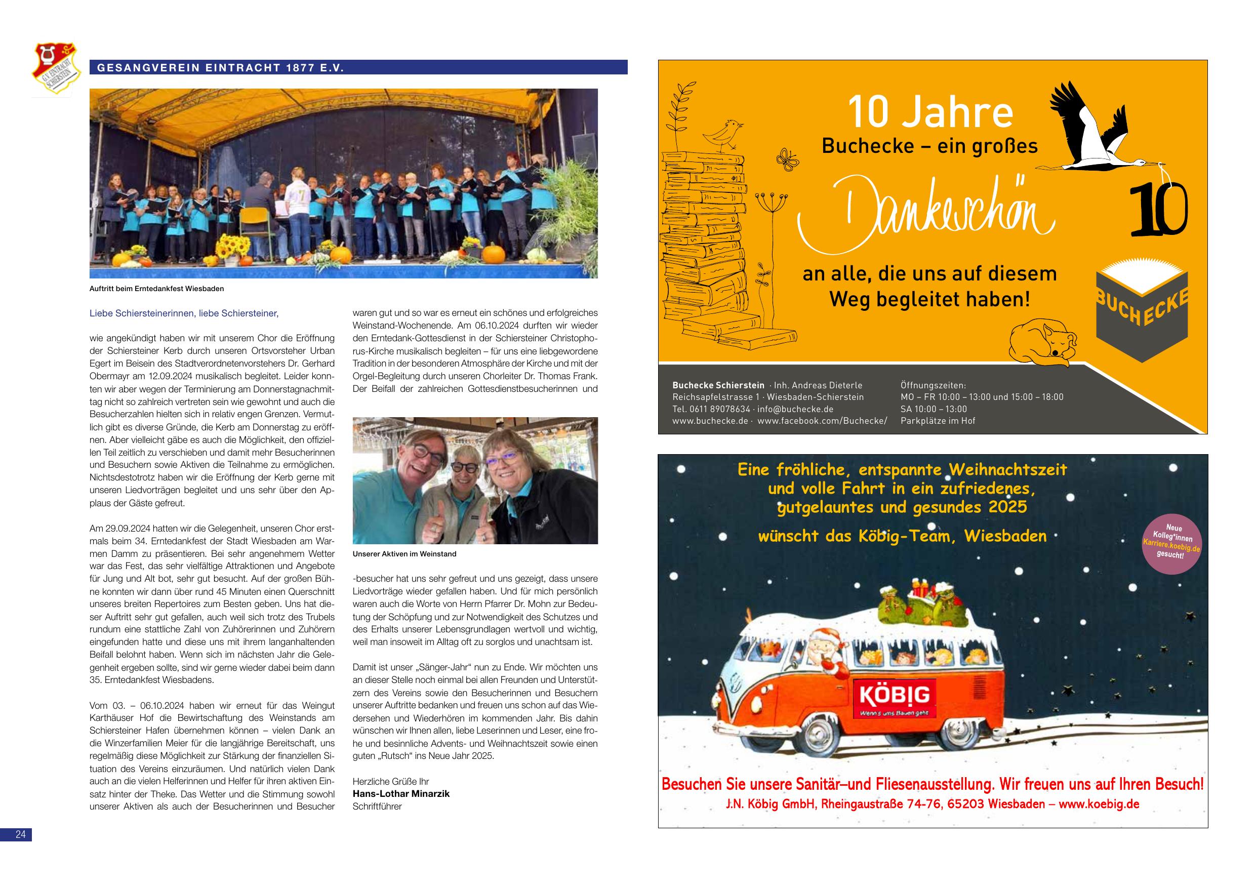 Vom 03. – 06.10.2024 haben wir erneut für das Weingut Karthäuser Hof die Bewirtschaftung des Weinstands am Schiersteiner Hafen übernehmen können – vielen Dank an die Winzerfamilien Meier für die langjährige Bereitschaft, uns regelmäßig diese Möglichkeit zur Stärkung der finanziellen Situation des Vereins einzuräumen. Und natürlich vielen Dank an die vielen Helferinnen und Helfer für ihren aktiven Einsatz hinter der Theke. Das Wetter und die Stimmung sowohl unserer Aktiven als auch der Besucherinnen und Besucher waren gut und so war es erneut ein schönes und erfolgreiches Weinstand-Wochenende. Am 06.10.2024 durften wir wieder den Erntedank-Gottesdienst in der Schiersteiner Christophorus-Kirche musikalisch begleiten – für uns eine liebgewordene Tradition in der besonderen Atmosphäre der Kirche und mit der Orgel-Begleitung durch unseren Chorleiter Dr. Thomas Frank. Der Beifall der zahlreichen Gottesdienstbesucherinnen und -besucher hat uns sehr gefreut und uns gezeigt, dass unsere Liedvorträge wieder gefallen haben. Und für mich persönlich waren auch die Worte von Herrn Pfarrer Dr. Mohn zur Bedeutung der Schöpfung und zur Notwendigkeit des Schutzes und des Erhalts unserer Lebensgrundlagen wertvoll und wichtig, weil man insoweit im Alltag oft zu sorglos und unachtsam ist.