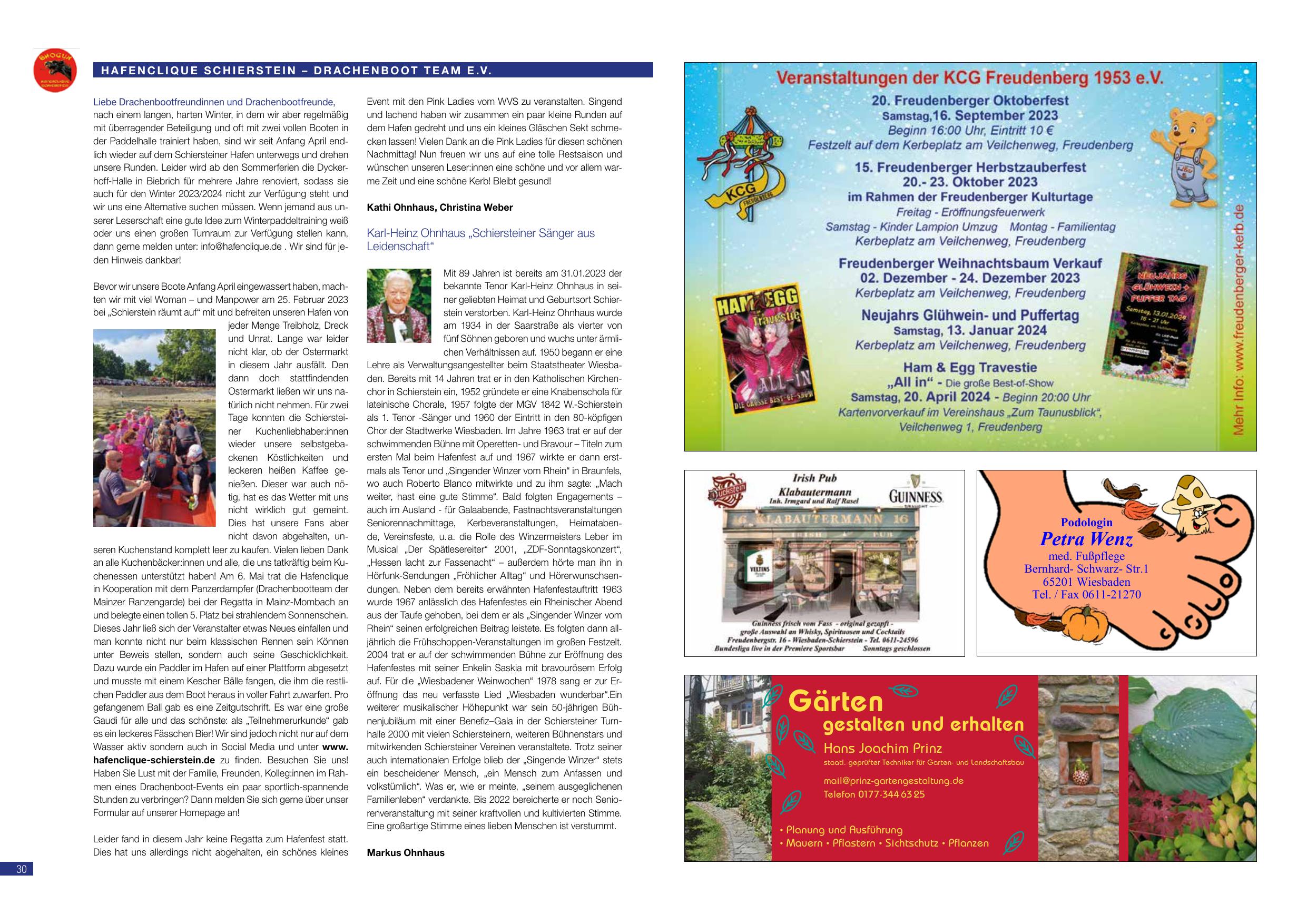 Bevor wir unsere Boote Anfang April eingewassert haben, machten wir mit viel Woman – und Manpower am 25. Februar 2023 bei „Schierstein räumt auf“ mit und befreiten unseren Hafen von jeder Menge Treibholz, Dreck und Unrat. Lange war leider nicht klar, ob der Ostermarkt in diesem Jahr ausfällt. Den dann doch stattfindenden Ostermarkt ließen wir uns natürlich nicht nehmen. Für zwei Tage konnten die Schiersteiner Kuchenliebhaber:innen wieder unsere selbstgebackenen Köstlichkeiten und leckeren heißen Kaffee genießen. Dieser war auch nötig, hat es das Wetter mit uns nicht wirklich gut gemeint. Das hat unsere Fans aber nicht davon abgehalten, unseren Kuchenstand komplett leer zu kaufen. Vielen lieben Dank an alle Kuchenbäcker:innen und alle, die uns tatkräftig beim Kuchenessen unterstützt haben! Am 6. Mai trat die Hafenclique in Kooperation mit dem Panzerdampfer (Drachenbootteam der Mainzer Ranzengarde) bei der Regatta in Mainz-Mombach an und belegte einen tollen 5. Platz bei strahlendem Sonnenschein. Dieses Jahr ließ sich der Veranstalter etwas Neues einfallen und man konnte nicht nur beim klassischen Rennen sein Können unter Beweis stellen, sondern auch seine Geschicklichkeit. Dazu wurde ein Paddler im Hafen auf einer Plattform abgesetzt und musste mit einem Kescher Bälle fangen, die ihm die restlichen Paddler aus dem Boot heraus in voller Fahrt zuwarfen. Pro gefangenem Ball gab es eine Zeitgutschrift. Es war eine große Gaudi für alle und das schönste: als „Teilnehmerurkunde“ gab es ein leckeres Fässchen Bier! Wir sind jedoch nicht nur auf dem Wasser aktiv sondern auch in Social Media und unter www.hafenclique-schierstein.de zu finden. Besuchen Sie uns! Haben Sie Lust mit der Familie, Freunden, Kolleginnen im Rahmen eines Drachenboot-Events ein paar sportlich-spannende Stunden zu verbringen? Dann melden Sie sich gerne über unser Formular auf unserer Homepage an!