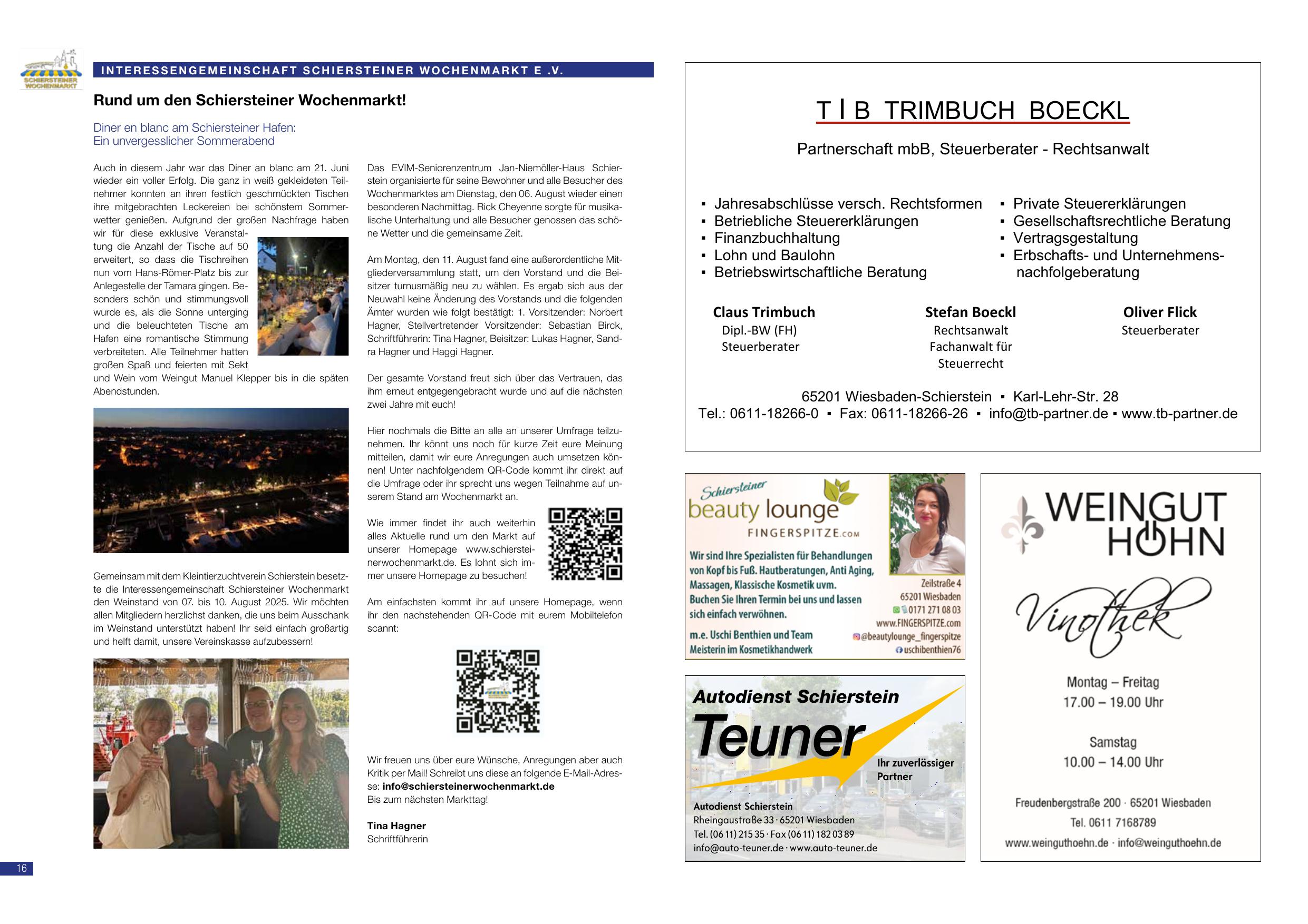- 07. bis 10. August 2025 – Weinstand der Interessengemeinschaft Schiersteiner Wochenmarkt gemeinsam mit dem Kleintierzuchtverein Schierstein