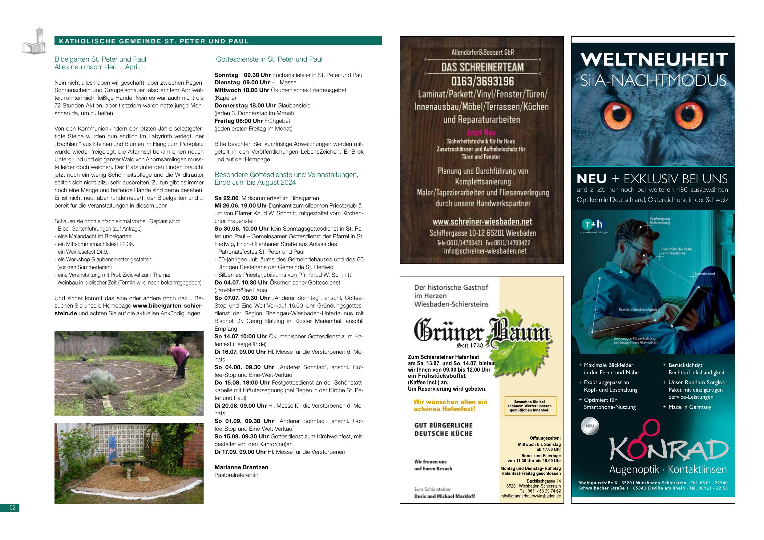 So 07.07. 09.30 Uhr „Anderer Sonntag“, anschl. Coffee-Stop und Eine-Welt-Verkauf 16.00 Uhr Gründungsgottesdienst der Region Rheingau-Wiesbaden-Untertaunus mit Bischof Dr. Georg Bätzing in Kloster Marienthal, anschl. Empfang