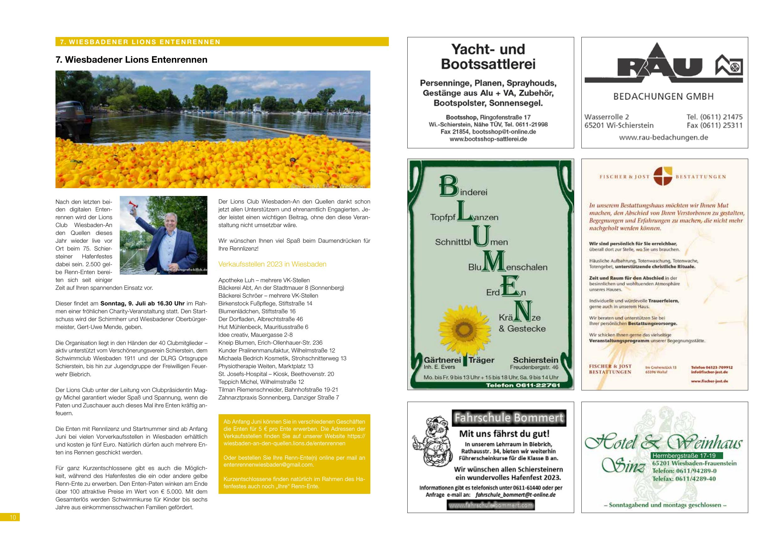 - Sonntag, 9. Juli – ab 16.30 Uhr – 7. Wiesbadener Lions Entenrennen im Rahmen einer fröhlichen Charity-Veranstaltung; Startschuss durch Schirmherr und Wiesbadener Oberbürgermeister Gert-Uwe Mende – (75. Schiersteiner Hafenfest)