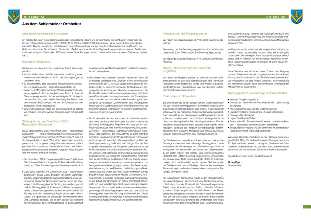 ich möchte Sie auch in der Osterausgabe des Schiersteiner Lebens wie gewohnt über die wichtigsten Ergebnisse der letzten Ortsbeiratssitzungen am 05.11.2025, 18.12.2025 und 28.01.2026 informieren. Leider kann ich hier nicht alle behandelten Themen ausführlich darstellen und beschränke mich auf wenige Punkte, insbesondere auf die Situation der Hafenschule und der Sporthallen in Schierstein. Sie können aber sämtliche Tagesordnungspunkte im Internet, Politisches In-formationssystem Wiesbaden (PIWi) nachlesen. Oder Sie fragen einfach bei mir oder einem anderen Ortsbeiratsmitglied nach.