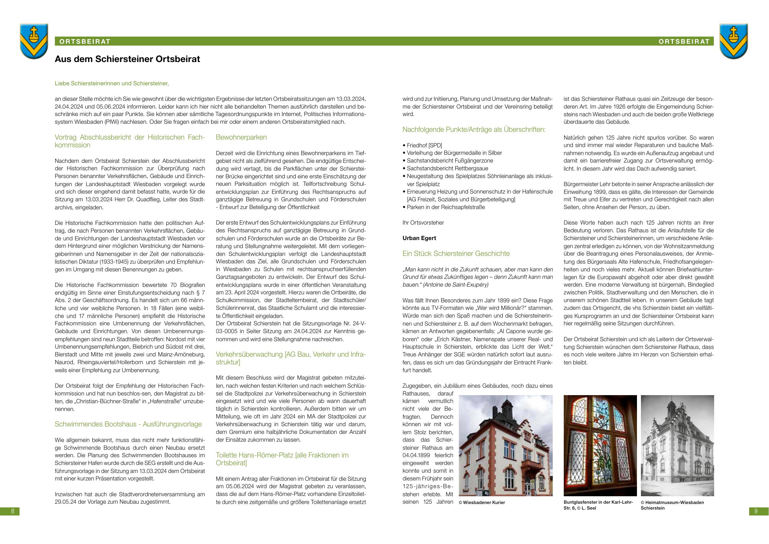 - 13.03.2024 – Ortsbeiratssitzung; Vorstellung der Ausführungsvorlage Schwimmendes Bootshaus; Vortrag Abschlussbericht der Historischen Fachkommission (Herr Dr. Quadflieg eingeladen) – (Schierstein)