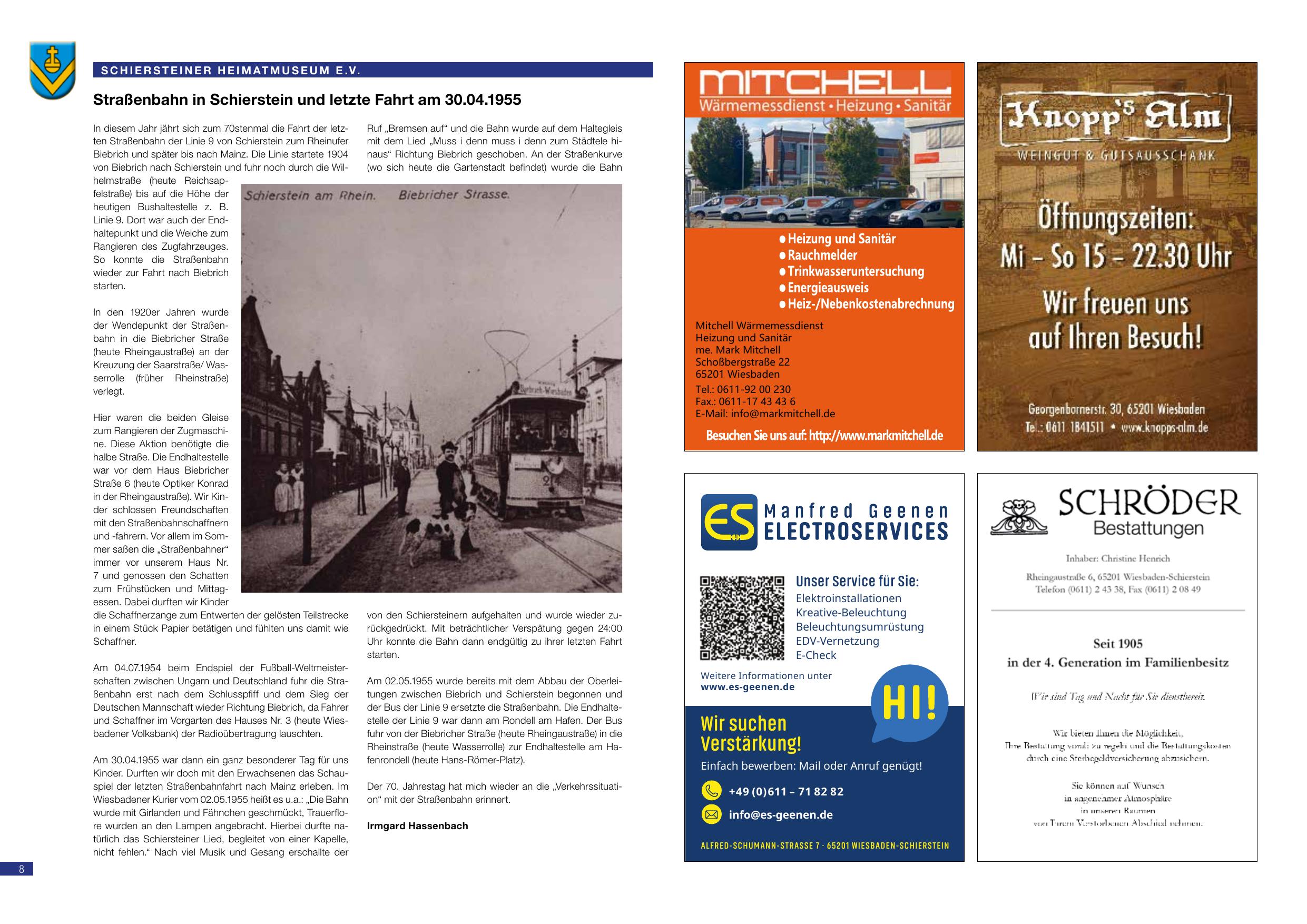 In diesem Jahr jährt sich zum 70stenmal die Fahrt der letzten Straßenbahn der Linie 9 von Schierstein zum Rheinufer Biebrich und später bis nach Mainz. Die Linie startete 1904 von Biebrich nach Schierstein und fuhr noch durch die Wilhelmstraße (heute Reichsapfelstraße) bis auf die Höhe der heutigen Bushaltestelle z. B. Linie 9. Dort war auch der Endhaltepunkt und die Weiche zum Rangieren des Zugfahrzeuges. So konnte die Straßenbahn wieder zur Fahrt nach Biebrich starten.