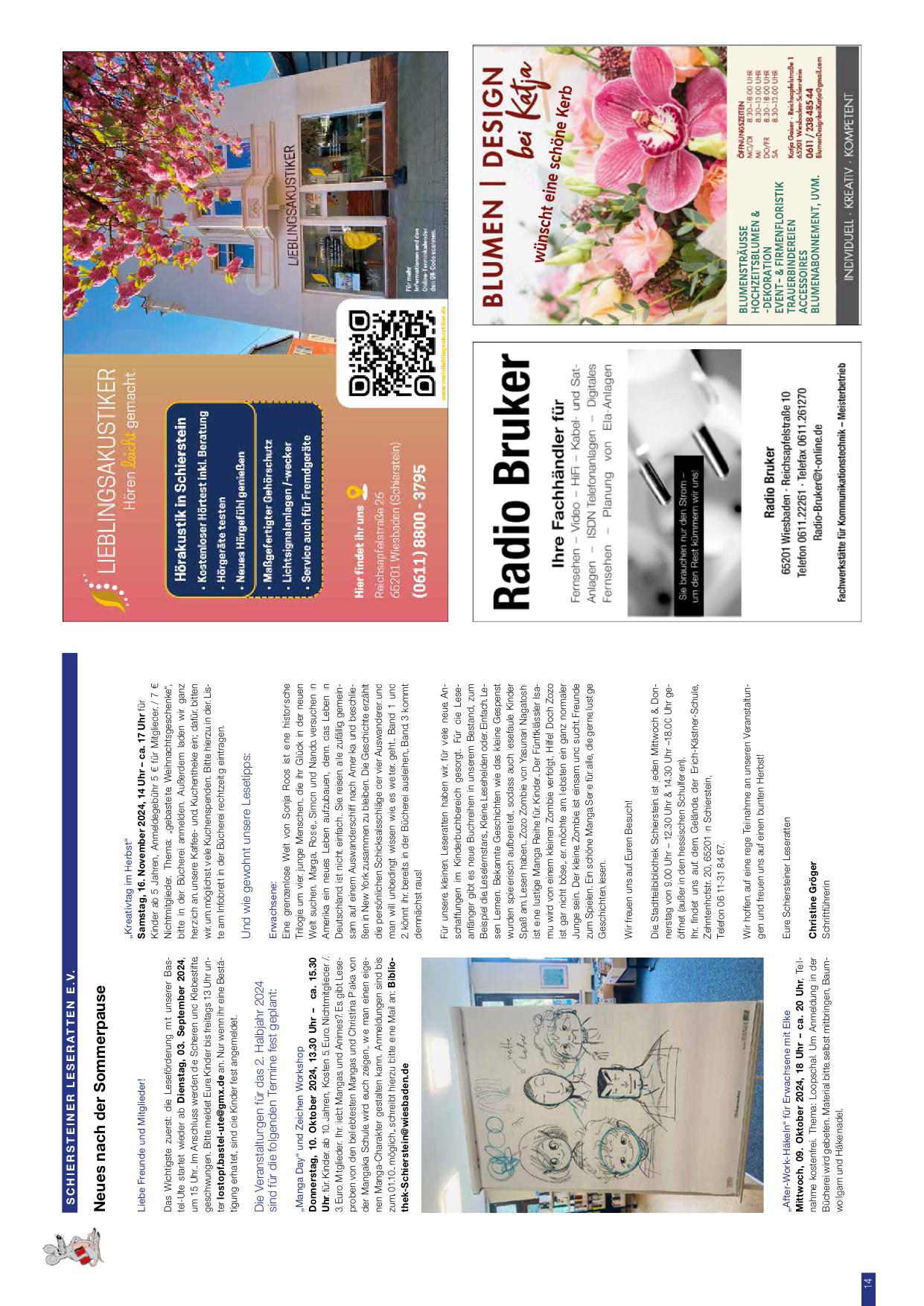 Donnerstag, 10. Oktober 2024, 13.30 Uhr – ca. 15.30 Uhr für Kinder ab 10 Jahren, Kosten 5 Euro Nichtmitglieder / 3 Euro Mitglieder. Ihr liebt Mangas und Animes? Es gibt Leseproben von den beliebtesten Mangas und Christina Plaka von der Mangaka Schule wird auch zeigen, wie man einen eigenen Manga-Charakter gestalten kann. Anmeldungen sind bis zum 01.10. möglich, schreibt hierzu bitte eine Mail an: Bibliothek-Schierstein@wiesbaden.de