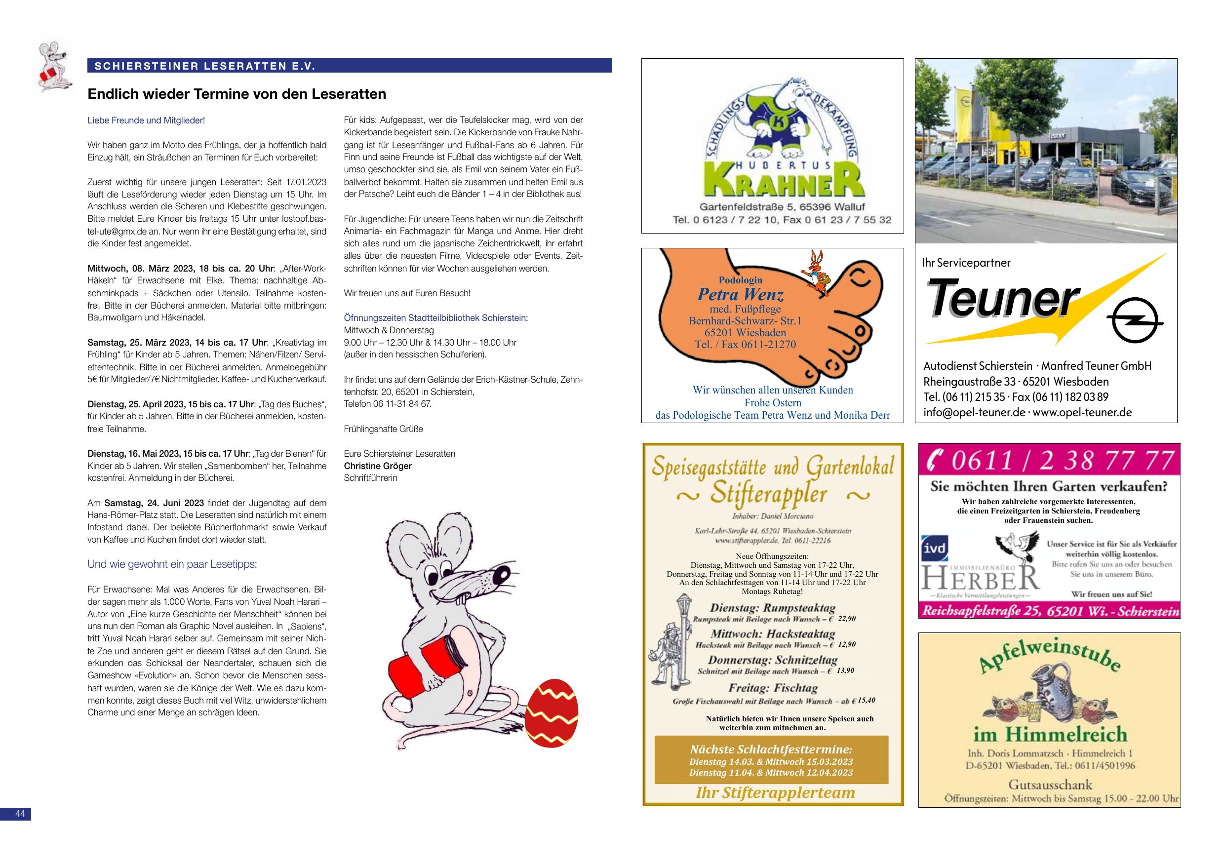 Zuerst wichtig für unsere jungen Leseratten: Seit 17.01.2023 läuft die Leseförderung wieder jeden Dienstag um 15 Uhr. Im Anschluss werden die Scheren und Klebestifte geschwungen. Bitte meldet Eure Kinder bis freitags 15 Uhr unter lostopf.bastel-ute@gmx.de an. Nur wenn ihr eine Bestätigung erhaltet, sind die Kinder fest angemeldet.