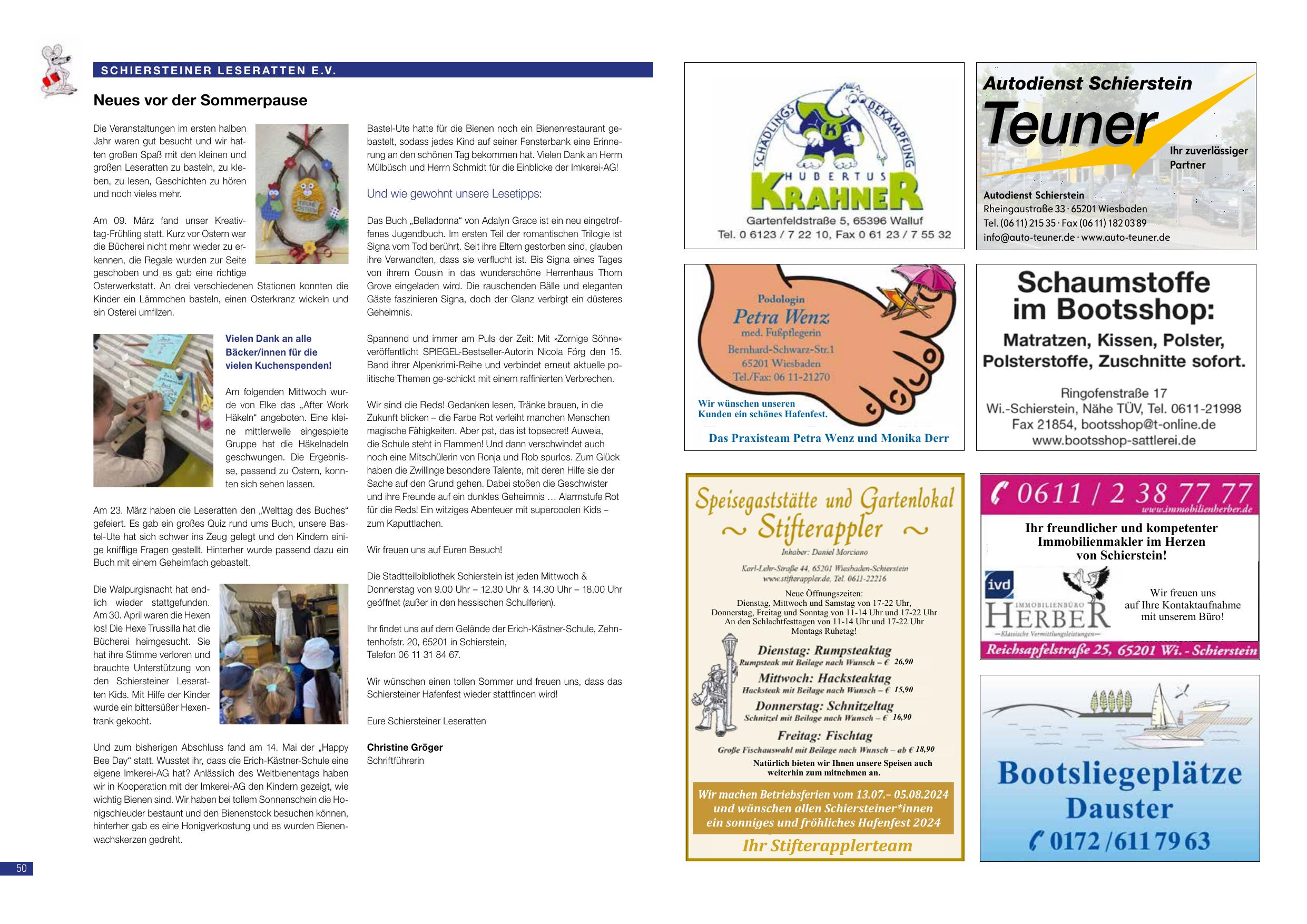 - 14. Mai – Happy Bee Day: Weltbienentag, Kooperation mit Imkerei-AG der Erich-Kästner-Schule, Honigschleuder, Bienenstock, Honigverkostung, Bienenwachskerzen drehen, Bienenrestaurant von Bastel-Ute – (Erich-Kästner-Schule / Stadtteilbibliothek Schierstein)