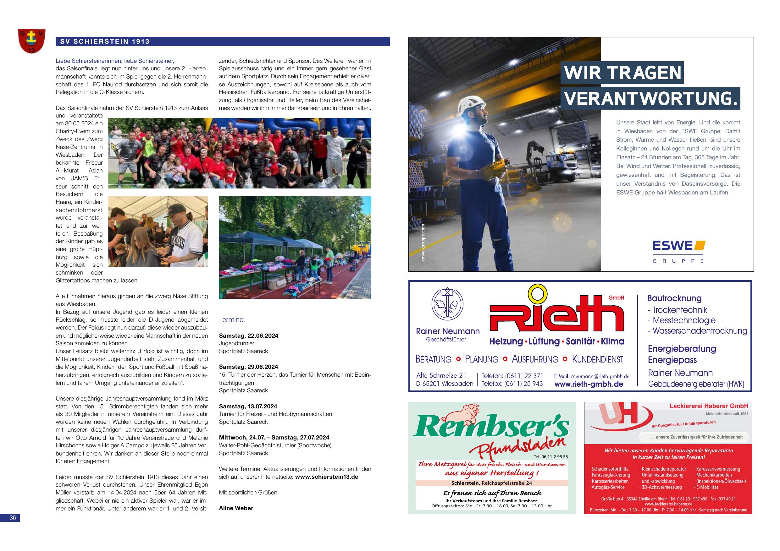 Das Saisonfinale nahm der SV Schierstein 1913 zum Anlass und veranstaltete am 30.05.2024 ein Charity-Event zum Zweck des Zwerg Nase-Zentrums in Wiesbaden: Der bekannte Friseur Ali-Murat Aslan von JAM’S Friseur schnitt den Besuchern die Haare, ein Kindersachenflohmarkt wurde veranstaltet und zur weiteren Bespaßung der Kinder gab es eine große Hüpfburg sowie die Möglichkeit sich schminken oder Glitzertattoos machen zu lassen.