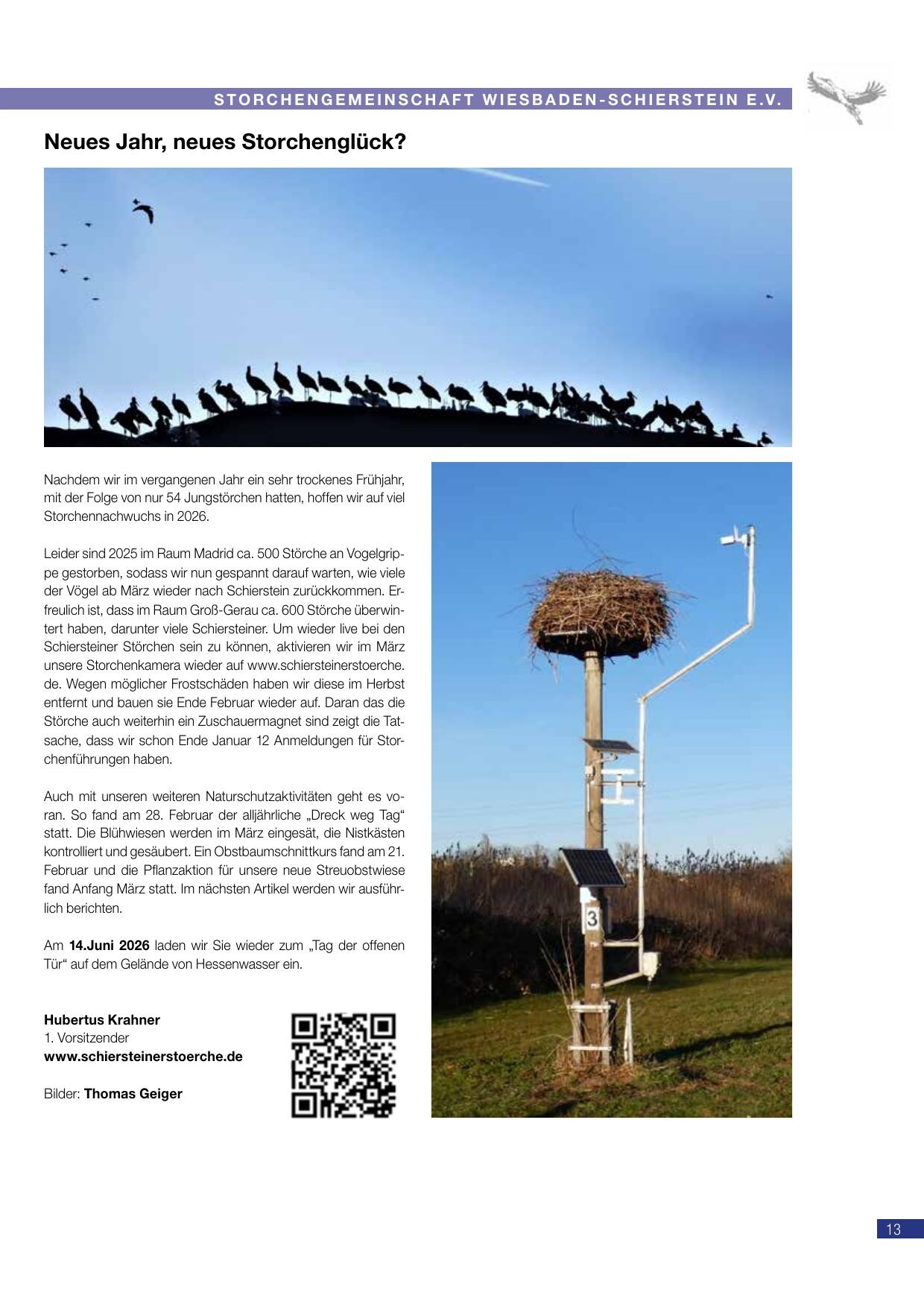 Leider sind 2025 im Raum Madrid ca. 500 Störche an Vogelgrippe gestorben, sodass wir nun gespannt darauf warten, wie viele der Vögel ab März wieder nach Schierstein zurückkommen. Erfreulich ist, dass im Raum Groß-Gerau ca. 600 Störche überwintert haben, darunter viele Schiersteiner. Um wieder live bei den Schiersteiner Störchen sein zu können, aktivieren wir im März unsere Storchenkamera wieder auf www.schiersteinerstoerche.de. Wegen möglicher Frostschäden haben wir diese im Herbst entfernt und bauen sie Ende Februar wieder auf. Daran dass die Störche auch weiterhin ein Zuschauermagnet sind zeigt die Tatsache, dass wir schon Ende Januar 12 Anmeldungen für Storchenführungen haben.