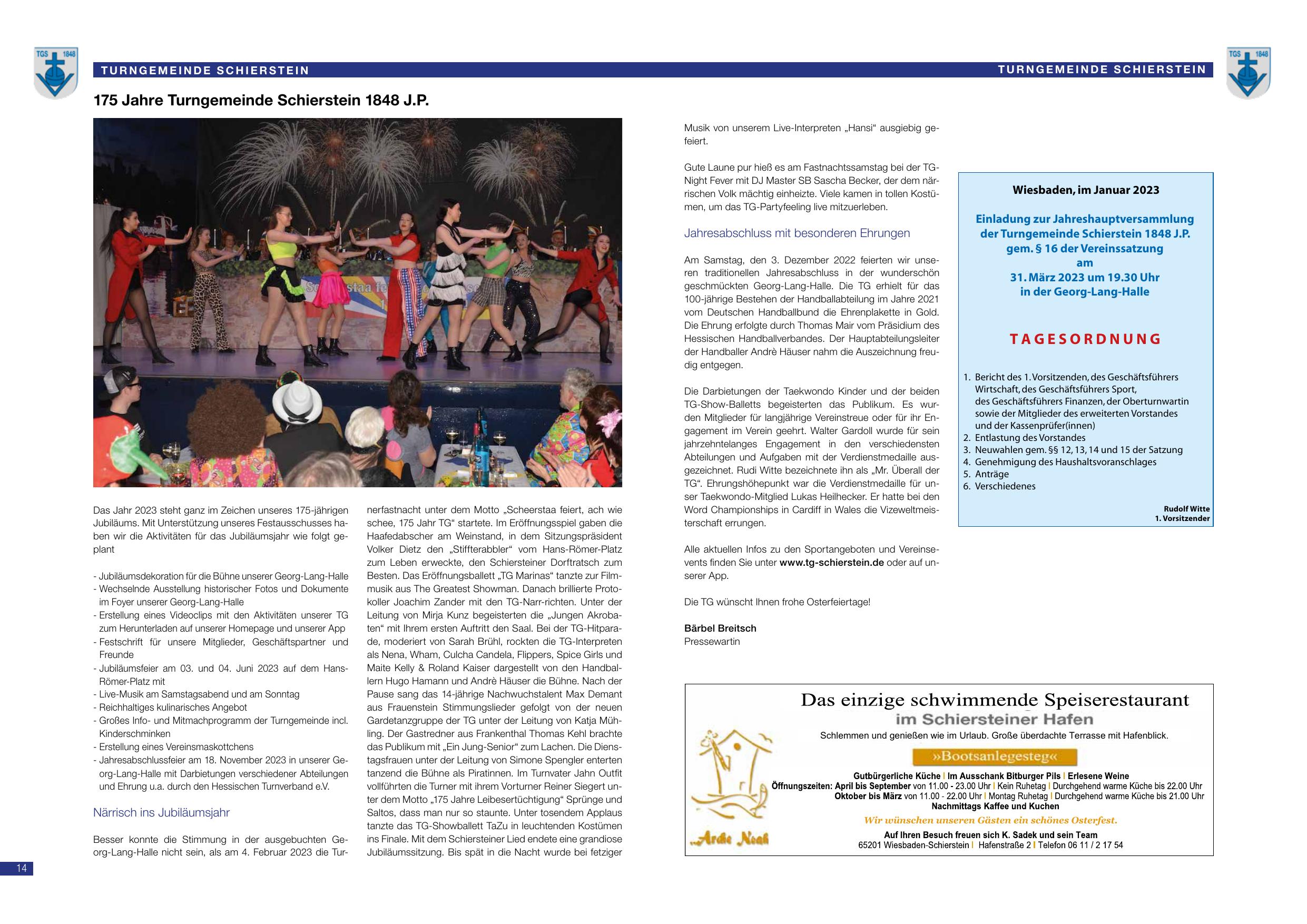Einladung zur Jahreshauptversammlung der Turngemeinde Schierstein 1848 J.P. gem. § 16 der Vereinssatzung am 31. März 2023 um 19.30 Uhr in der Georg-Lang-Halle