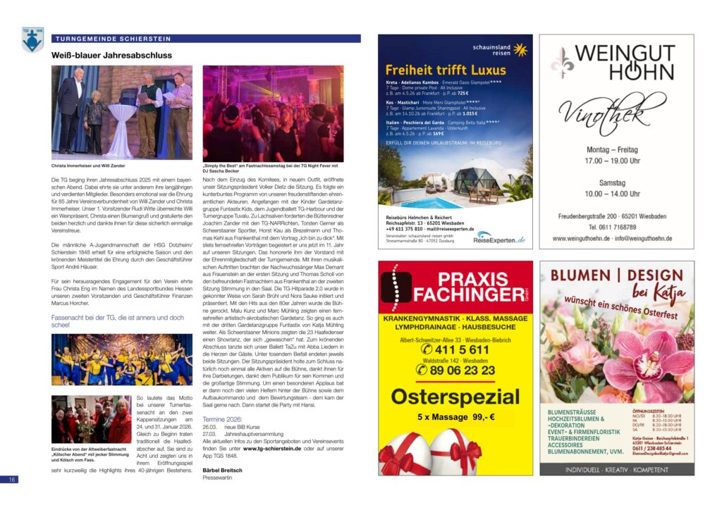 Alle aktuellen Infos zu den Sportangeboten und Vereinsevents finden Sie unter www.tg-schierstein.de oder auf unserer App TGS 1848.