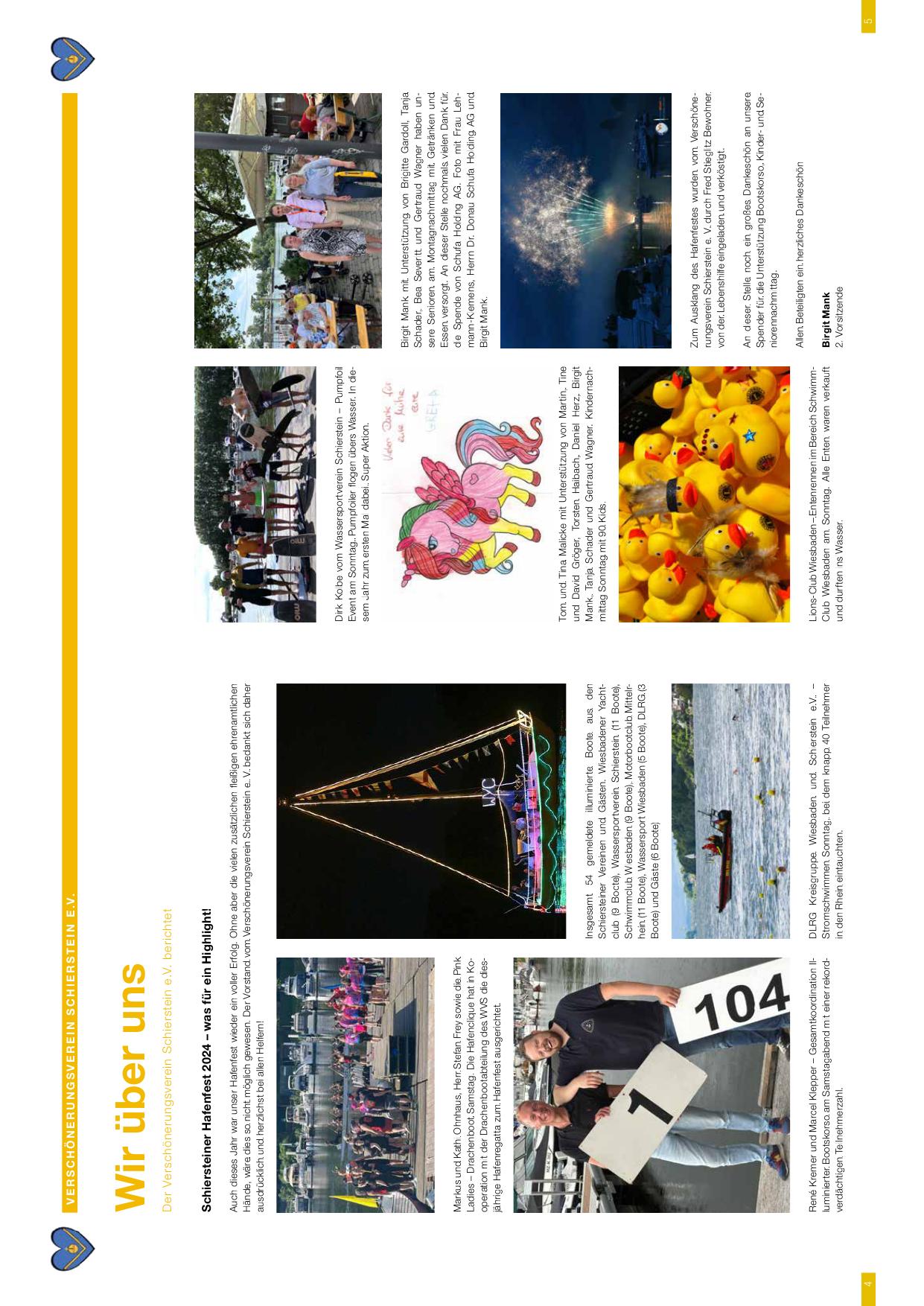 - Sonntag (Hafenfest 2024) – Pumfoil Event mit Dirk Kolbe; Kindernachmittag mit Tom und Tina Malicke (90 Kids); Entenrennen Lions-Club Wiesbaden; illuminierte Bootsparade mit knapp 40 Teilnehmern im Rhein – (Schiersteiner Hafen / Rhein)