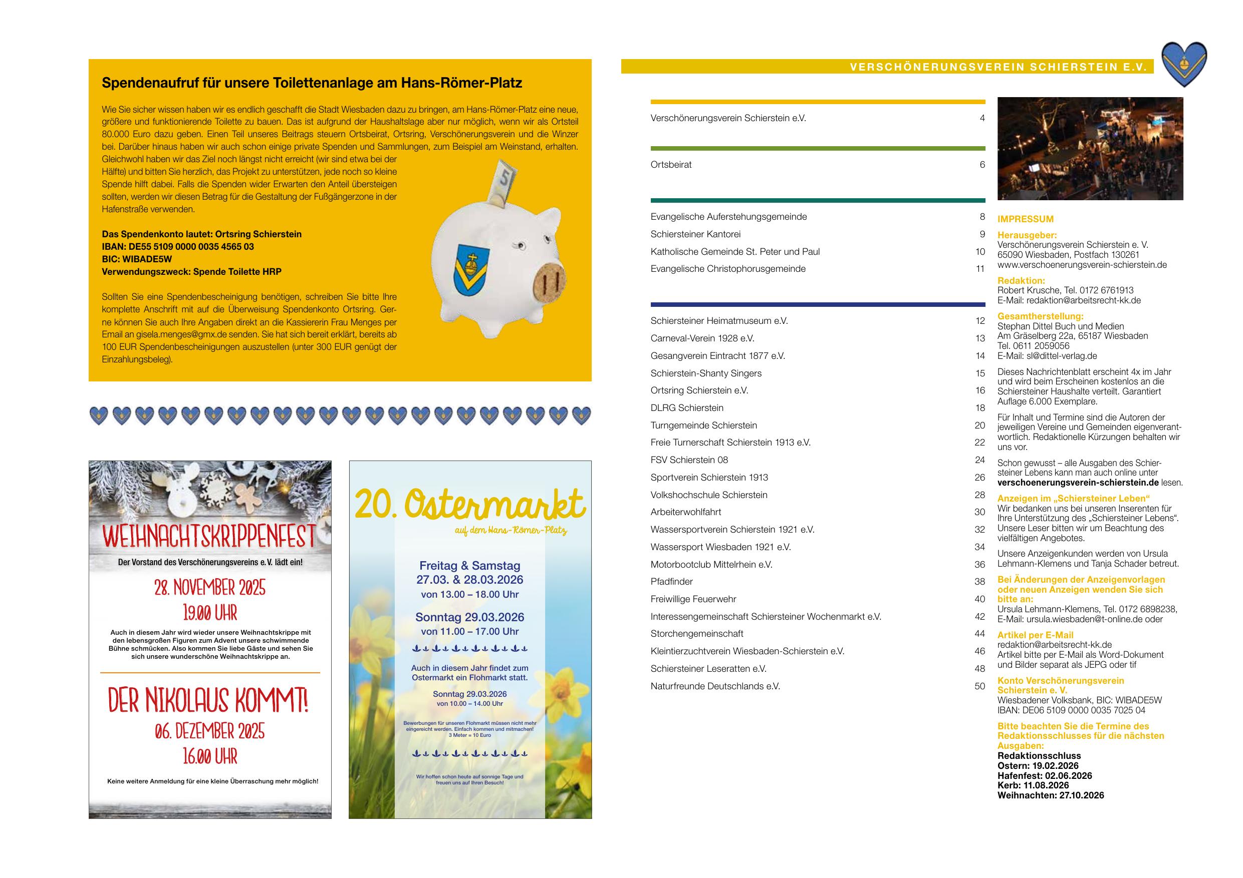 Dieses Nachrichtenblatt erscheint 4x im Jahr und wird beim Erscheinen kostenlos an die Schiersteiner Haushalte verteilt. Garantiert Auflage 6.000 Exemplare.