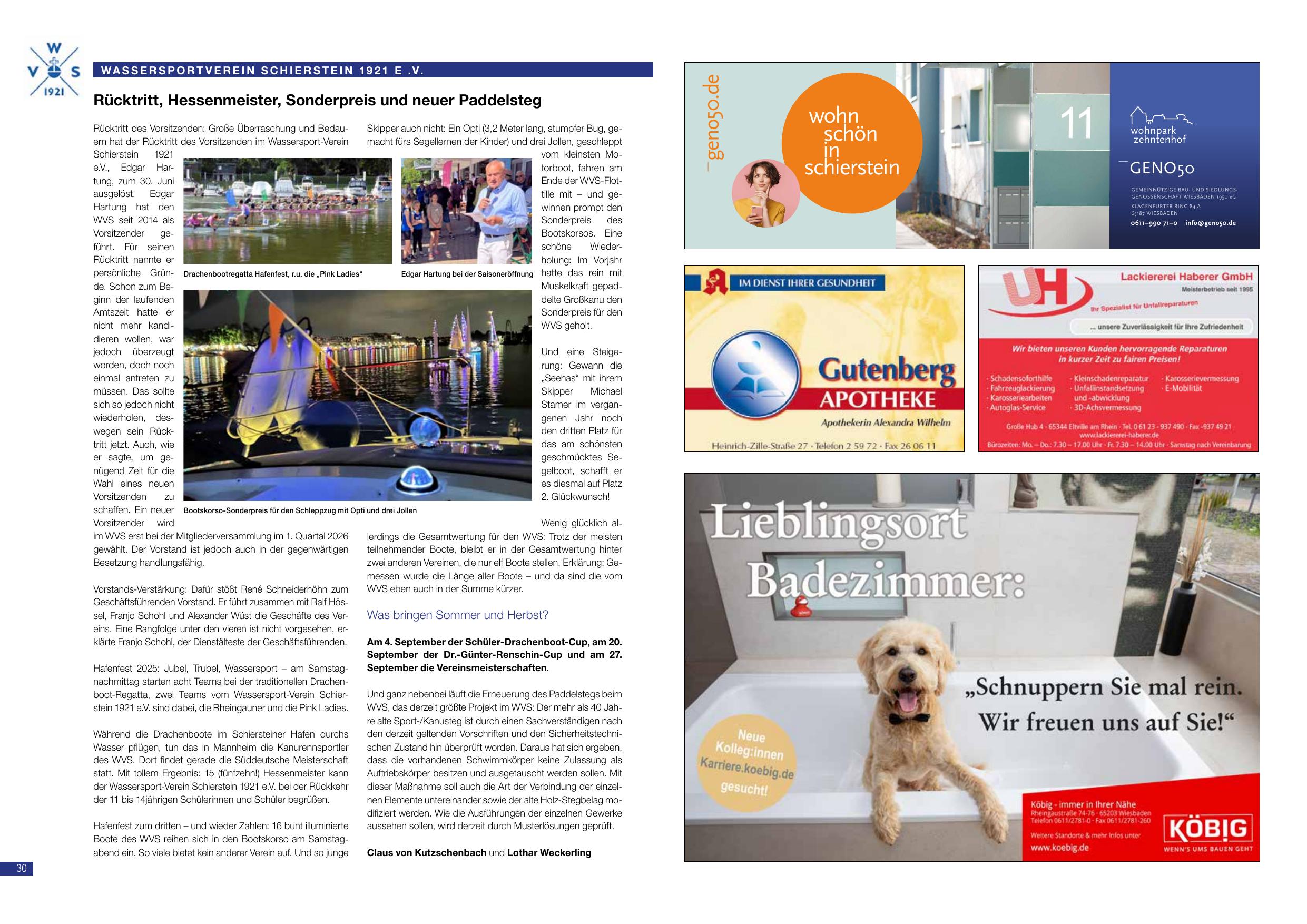 Rücktritt des Vorsitzenden: Große Überraschung und Bedauern hat der Rücktritt des Vorsitzenden im Wassersport-Verein Schierstein 1921 e.V., Edgar Hartung, zum 30. Juni ausgelöst. Edgar Hartung hat den WVS seit 2014 als Vorsitzender geführt. Für seinen Rücktritt nannte er persönliche Gründe. Schon zum Beginn der laufenden Amtszeit hatte er mehr nicht kandidieren wollen, war jedoch überzeugt worden, doch noch einmal antreten zu müssen. Das sollte sich so jedoch nicht wiederholen, deswegen sein Rücktritt jetzt. Auch, wie er sagte, um genügend Zeit für die Wahl eines neuen Vorsitzenden zu schaffen. Ein neuer Vorsitzender wird im WVS erst bei der Mitgliederversammlung im 1. Quartal 2026 gewählt. Der Vorstand ist jedoch auch in der gegenwärtigen Besetzung handlungsfähig.