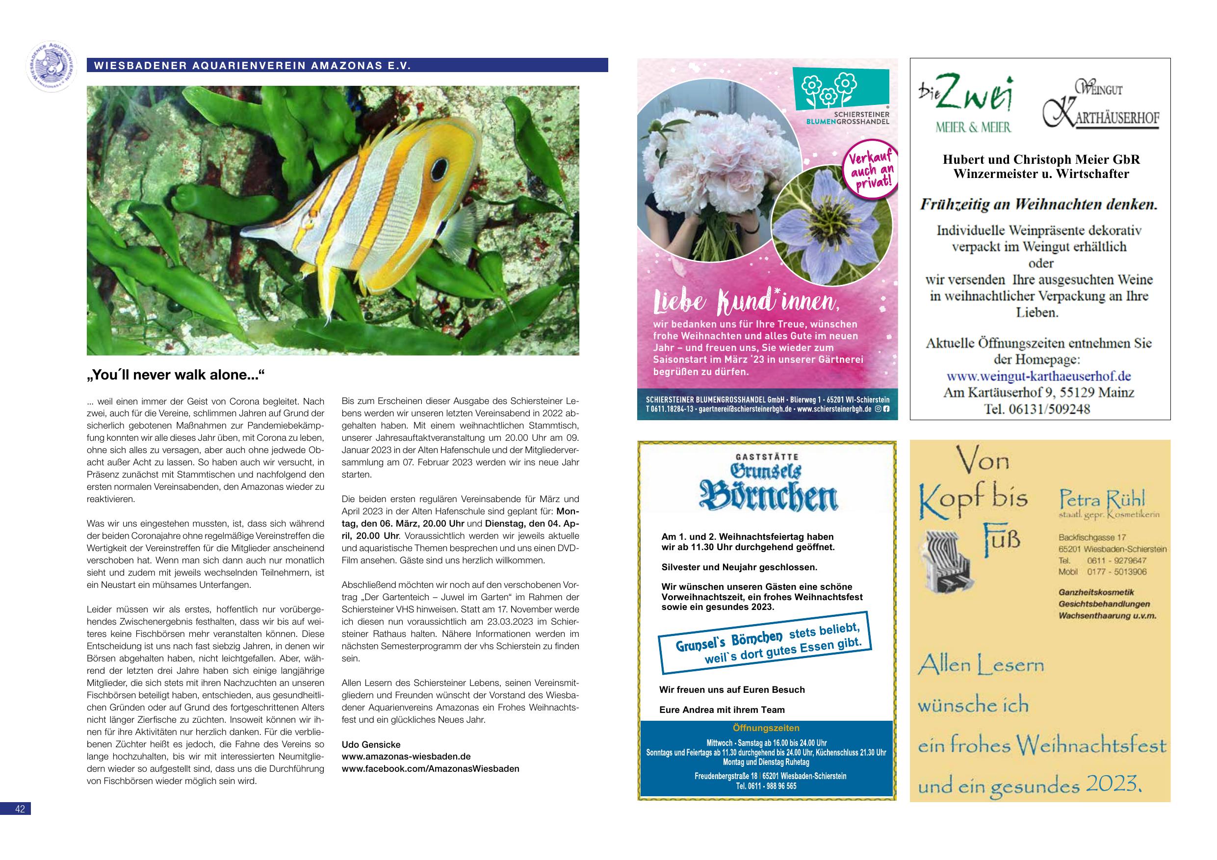Allen Lesern des Schiersteiner Lebens, seinen Vereinsmitgliedern und Freunden wünscht der Vorstand des Wiesbadener Aquarienvereins Amazonas ein Frohes Weihnachtsfest und ein glückliches Neues Jahr.